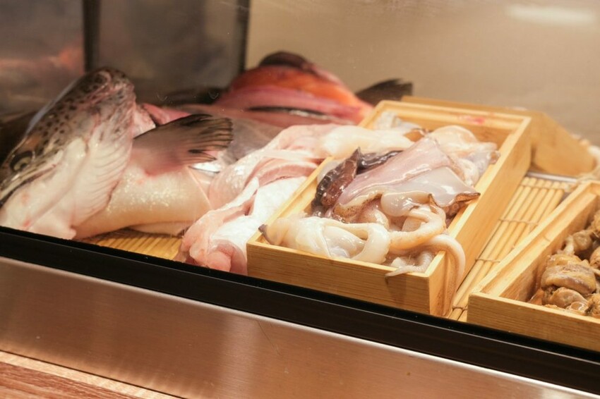 ▼【THE.春】採取半開式的廚房設計,透明櫃中擺放了新鮮的魚獲食材,還可以欣賞到師傅現做料理的手藝,滿足了大家吃日本料理的視覺享受~
