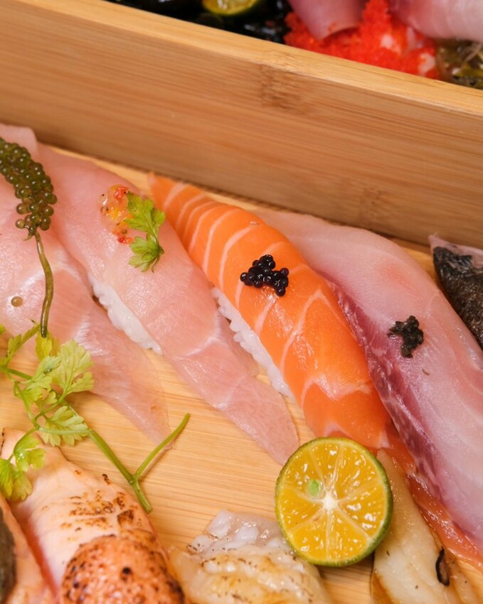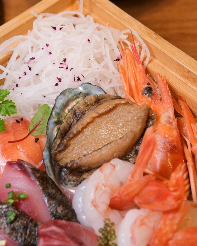 ▼視覺超浮誇的大脂海鮮珠寶盒,以精緻的木盒承載多達十幾款海鮮,包含鮭魚、鰹魚、旗魚、鯧魚、鮑魚、天使蝦、軟絲、尊鮭魚卵、干貝、海螺、蟹腳、章魚腳。