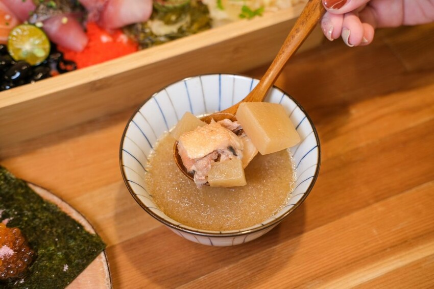 ▼點完餐會送上每人一碗味噌湯,鹹香的湯頭暖心又開胃,還能撈到不少的配料,喝完可以再免費續加~