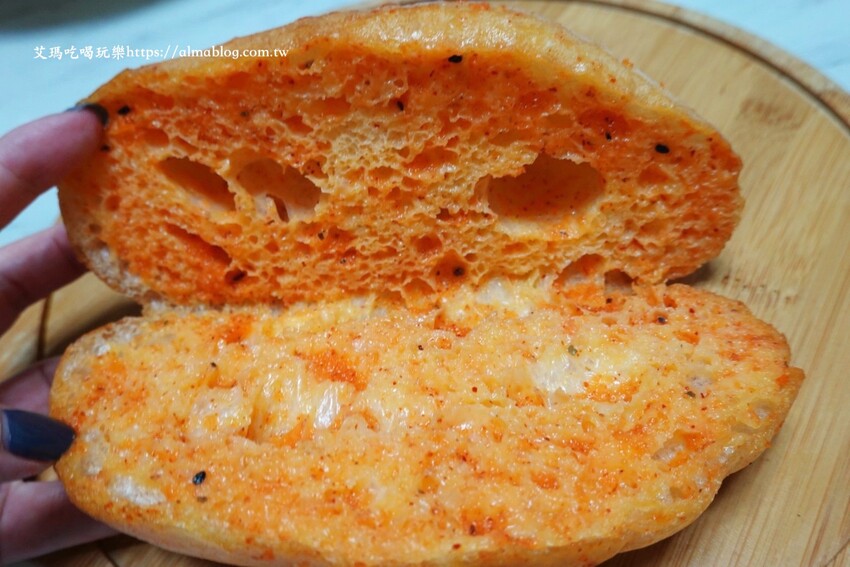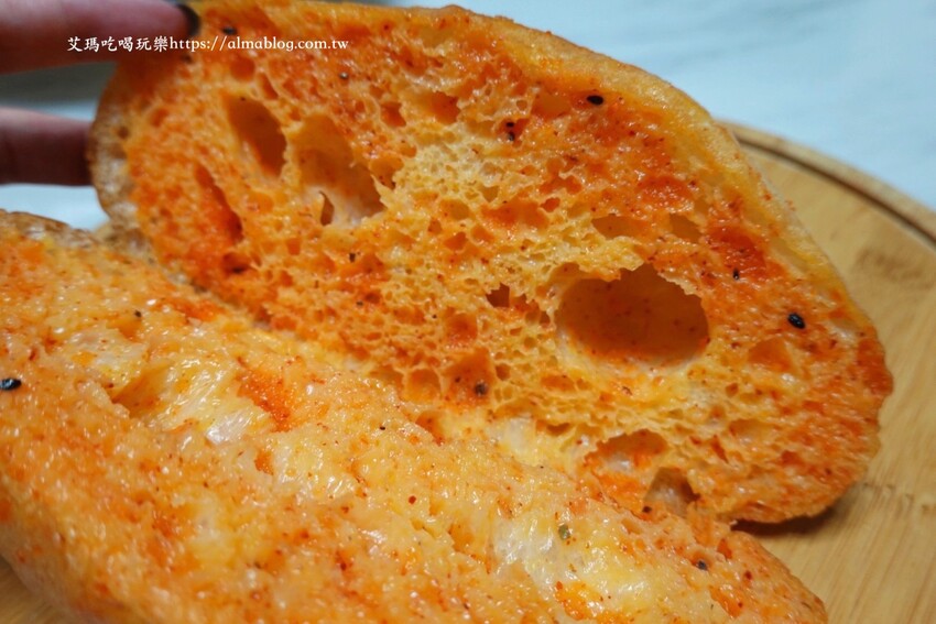 明太子醬與法國麵包,真的是最佳組合!每次看到都要買,也是許多女性顧客的首選,這明太子醬真的也沒在客氣,塗抹到看不到麵包色,麵包越嚼越香,就是鹹香夠味。