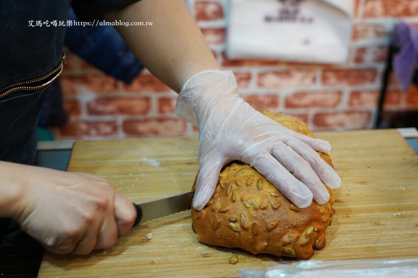 一整顆全麥高纖堅果太大!一整顆我可能要吃上兩天,這很貼心可以買半顆,麵包上層莫西哥醬加上南瓜子,麵包裡面有核桃、夏威夷果和榛果,麵包體比我想像還鬆軟,堅果香在口中漸漸蔓延,樸實的鄉村麵包。