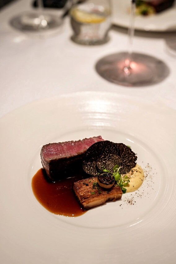與碳化牛油慕斯、馬鈴薯千層、松露片、牛肉汁