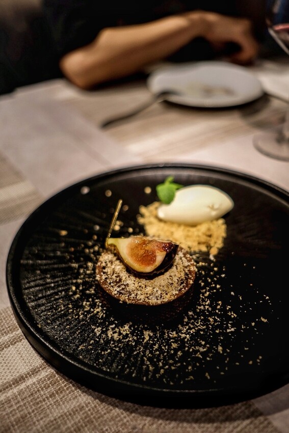 苦甜黑巧克力塔很棒,上頭放的新鮮無花果竟然裹上糖葫蘆那種薄脆不黏牙的糖衣,一口塔一口香草冰淇淋有夠幸福