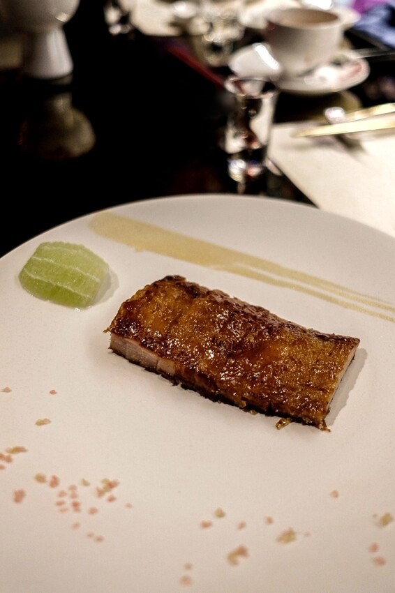 餐廳內部用大量鏡面元素、偏暗的燈光和中國風的餐具營造氣場十足的氛圍,雖然是粵菜但從餐廳命名和餐盤擺設又能感受到想要營造的法式美學;餐前送上碧螺春/白毫烏龍兩種茶品和開胃果醋,吃完小點醃漬金桔還得換盤子,感覺自己被像公主一般捧在掌心(太多了)