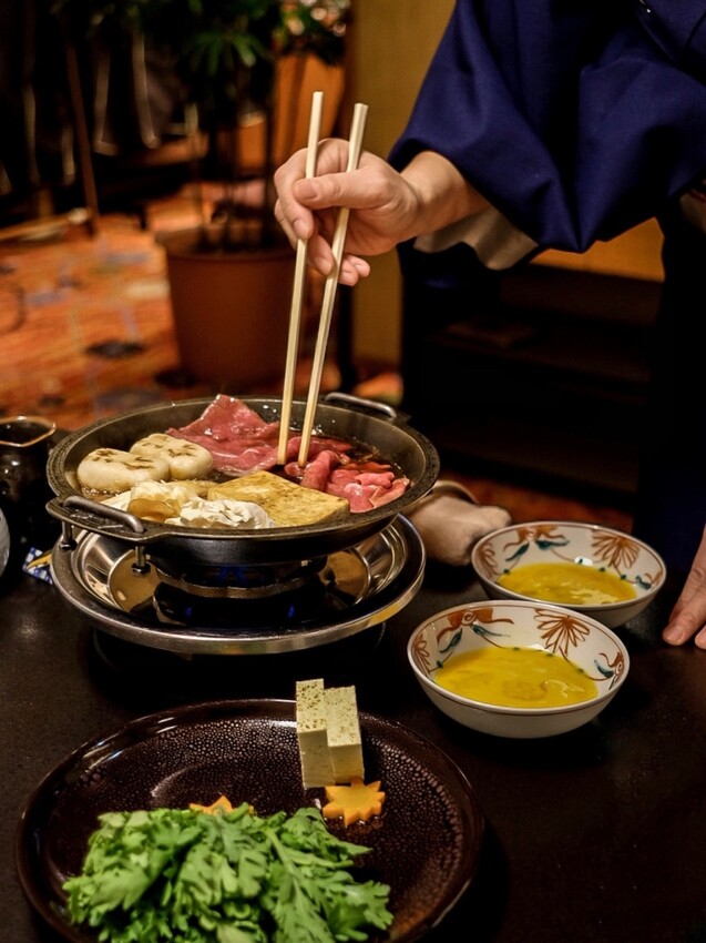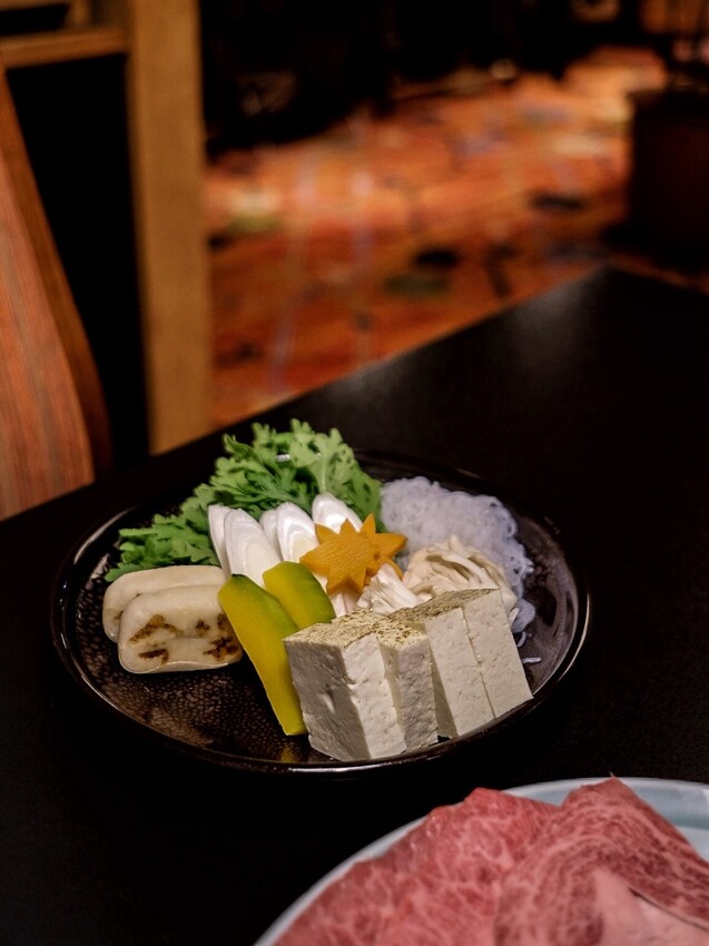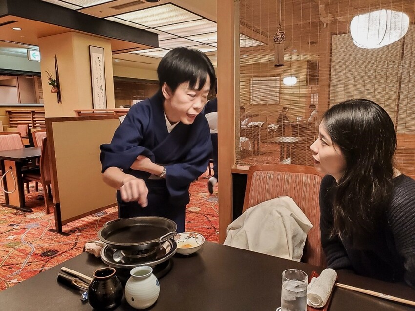 肉盤和菜盤上桌之後由穿著和服的服務員進行桌邊服務,先涮一片肉片讓我們沾蛋液吃,再繼續涮其他蔬菜豆腐等配菜,我覺得入口即化的牛肉片和配菜的口味都很棒,配上晶瑩剔透的日本米超級療癒,是會讓人懷念的味道