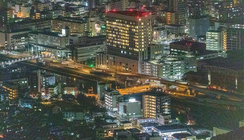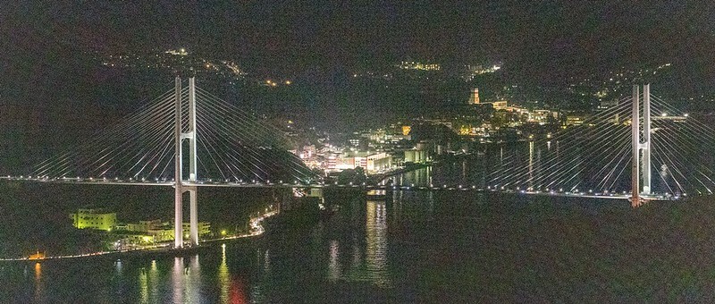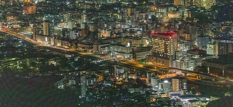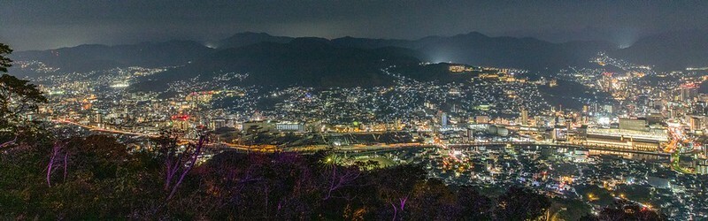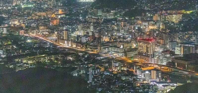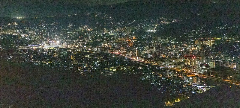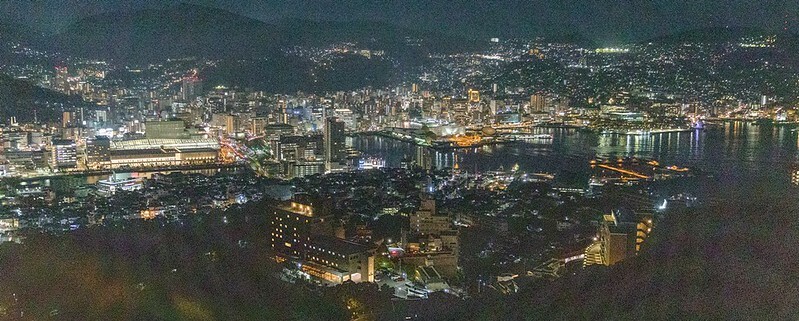 從2011年設置的展望台下基本上就是這兩張畫面的結合,一邊是河岸有一點像銀河,一邊則是長崎市、港合一的夜景。相較之下,可能不像北海道函館百萬夜景那麼的集中,比較像是帶狀的,燈多半集中在河、港兩邊。然後,這兩張都是用24-70的鏡頭拍的。