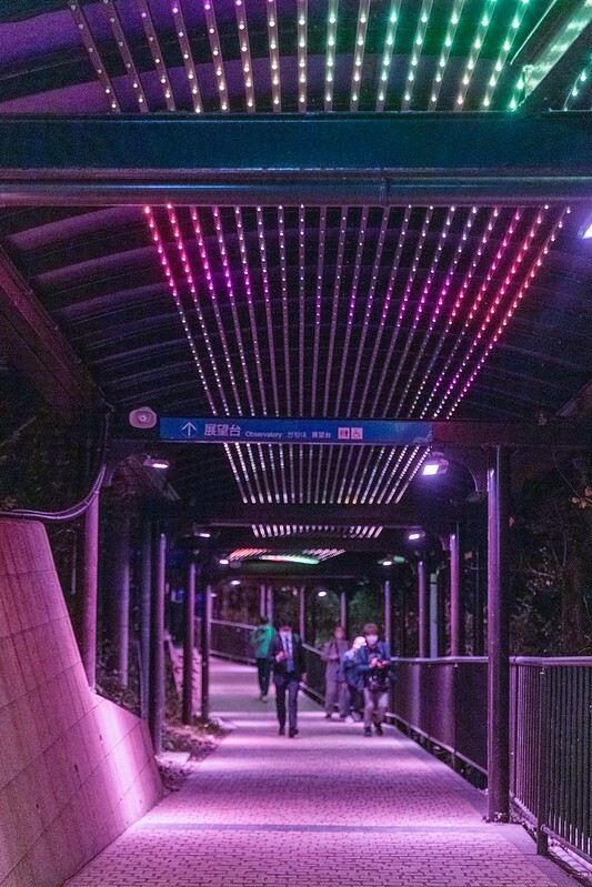 下了纜車往展望台的路上,有一條會變色的光之道,但但但,如果你去過咱們板橋的聖誕燈會,大概會無感才對.....。