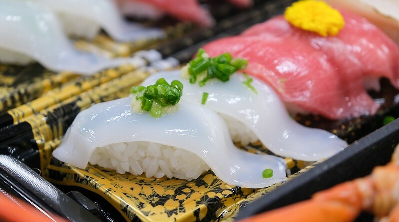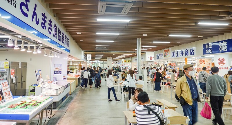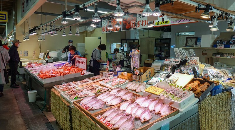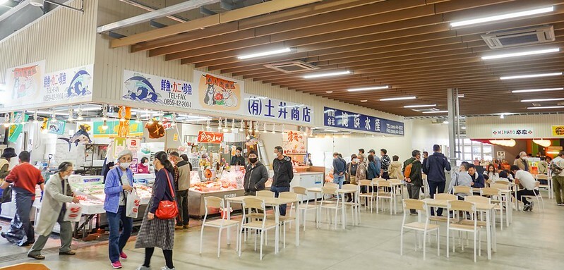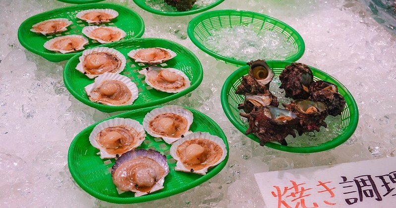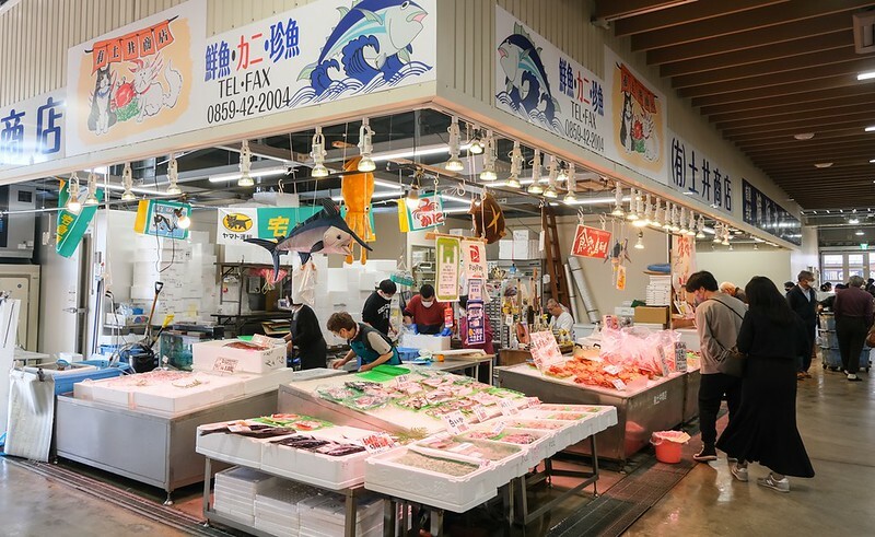 境港水産物直売センター集結了境港周邊12家漁舖,兩旁共有數十家漁舖,最吸引人的是在這可以現買現年,漁攤的走道中間就有許多可供遊客當場的大快朵頤的方桌。