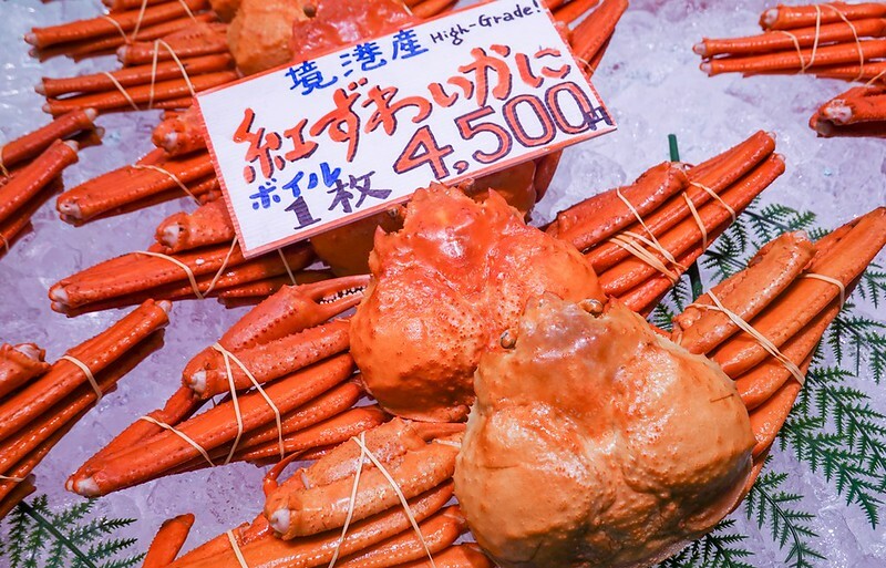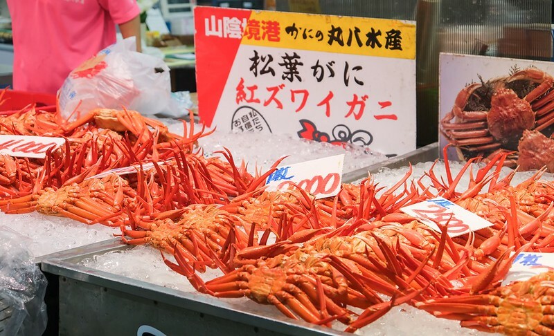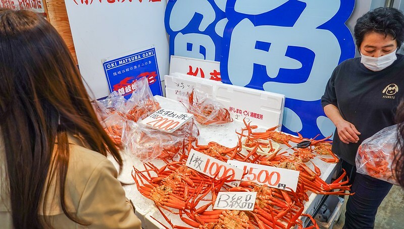 11月到2月是境港水產品批發中心最熱鬧的時期,大批遊客衝著物美價廉的鳥取蟹(松葉蟹+紅楚蟹)而來,幾乎有一半以上的攤位前擺著滿滿的鳥取蟹。