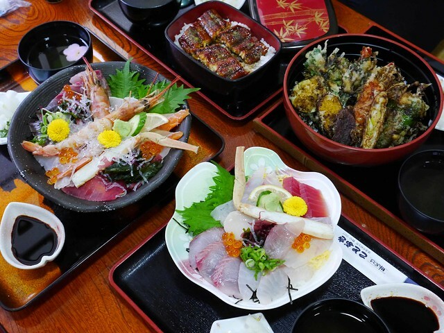 這裡也有幾家海鮮食堂賣著各種新鮮的海鮮丼,不過如果想吃海鮮丼個人非常推薦去境港水木茂之路上,吃百年老店「ことぶき」。