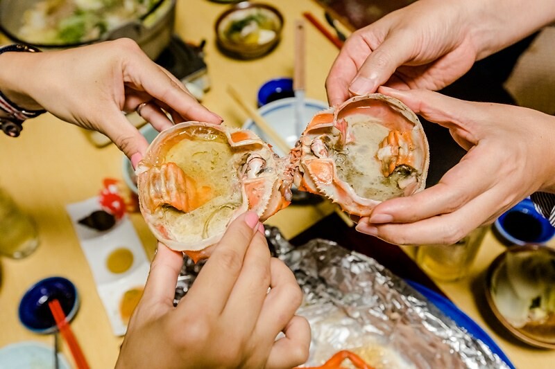 然後,拿著蟹腳去沾裡裡的蟹肉膏,最後再享用殼內剩下的蟹肉、蟹膏,如果身邊有清酒,也可以倒些進去(熱的比較適合)。什麼?你問我鳥取蟹好不好吃,那不是廢話嗎?鳥取可是我最喜歡吃螃蟹的地方,而且是cp值最高的地方。不來,鳥取吃蟹嗎?