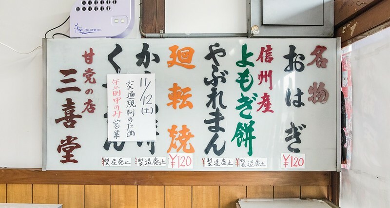 看了牆上的招牌本有六樣甜點,現今只剩おはぎ和迴轉燒,其他都沒作了。奶奶說三喜堂已經在這經營七十多年,她是第四代,但也不知道還能開多久,有天沒人賣了,就會收了...現在每天也只是做少少的量,給那些老顧客。