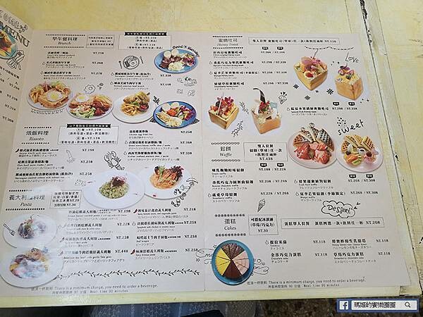 店裡主要提早午餐、燉飯、義大利麵、披薩、主廚推薦排餐和蜜糖吐司等美食,凡點一主餐則可加108元或158元組合為套餐,個人推薦加價組合成套餐,因為多了湯品和軟法外,飲料和蛋糕都是不限金額任選,非常超值!