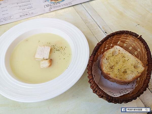 我們都選擇加108元升級套餐,多了湯品和軟法麵包,湯是玉米濃湯,裡面有些許玉米顆粒,湯的鹹淡適中,味道也挺好的;他們家的軟法麵包外層烤得香酥,中間是柔軟的,抹上蒜香醬讓我意猶未盡,還想再多吃一個。