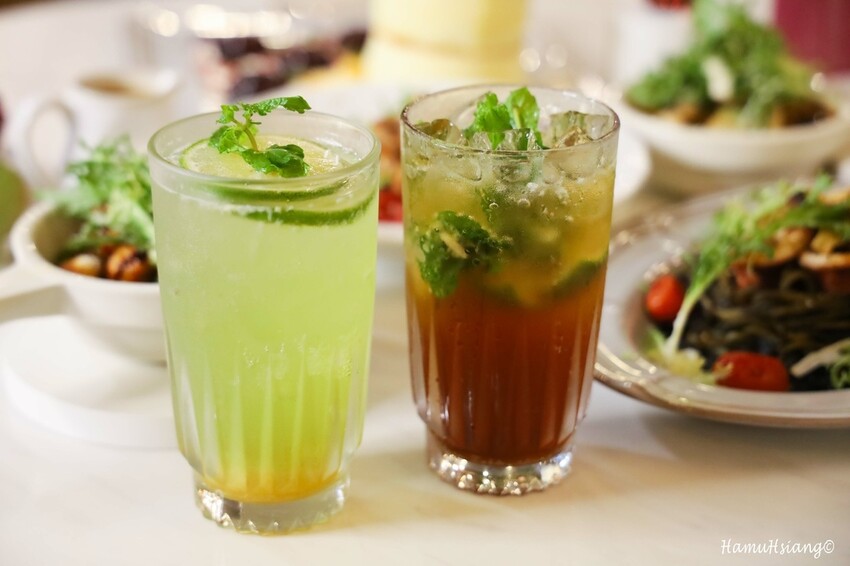 冬瓜蜜摩西多(右)-有冬瓜蜜.檸檬.薄荷葉.無糖氣泡水 喝起來冬瓜味完全不死甜,加上檸檬去中和掉他會甜的口味,喝起來清爽好喝讓人會一直想喝耶