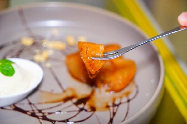 用甜點叉輕輕一切就能取用,單吃有蘋果的微酸香甜、肉桂的微甜辛辣香氣,