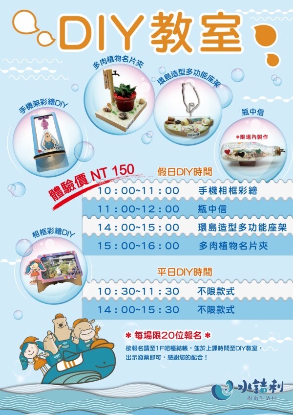 每場2p位報名體驗活動,平時的DIY體驗有兩場,假日DIY體驗有四場,想要體驗建議早些報名。
