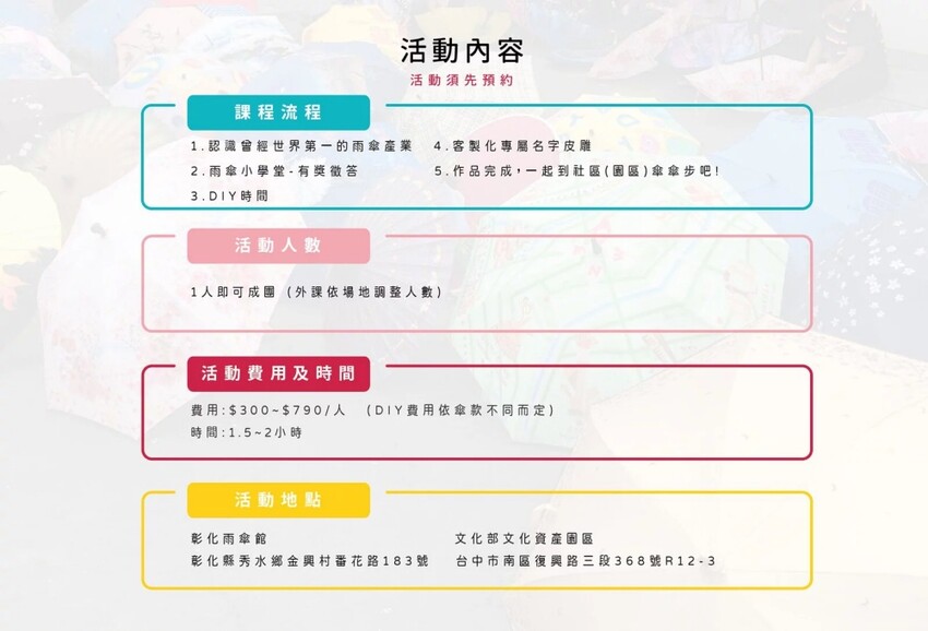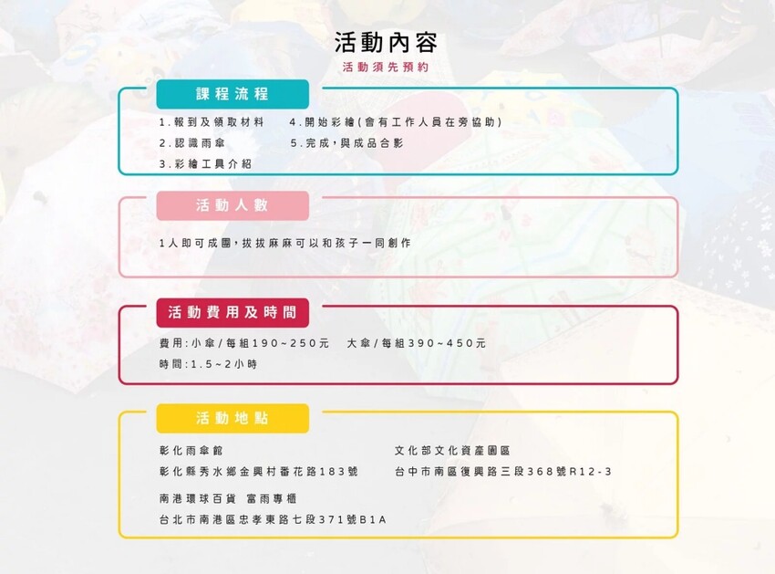 雨傘可以體驗DIY製作時間約1.5-2小時,小傘到大傘都有,活動一人也可以成行呦!