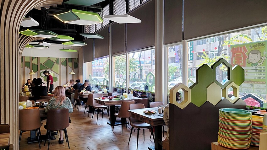 大喜鍋豐原店以拼接設計讓天花板超美超有型,而且整體空間宛如在森林間用餐的愜意~~