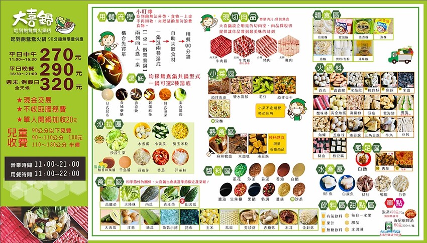 大喜鍋吃到飽鴛鴦火鍋用餐流程→櫃台先買單→2-4人為一桌→一鍋選兩種湯底→自助夾取食材→用餐90分鐘。
