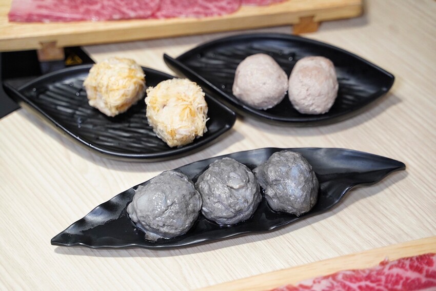 當天單點的手工火鍋料都讓我很驚艷,灰黑色的「手工墨魚花枝漿」一份有三大球,咬下去看得到滿滿的花枝塊,味道多汁鮮甜!「手工干貝花枝丸」一份兩顆,外表有一絲絲的干貝絲附著在上頭,可以說是高級版的花枝丸!「手工黑豬肉貢丸」一份兩顆,肉感十足且多汁鮮甜,有水準之上。