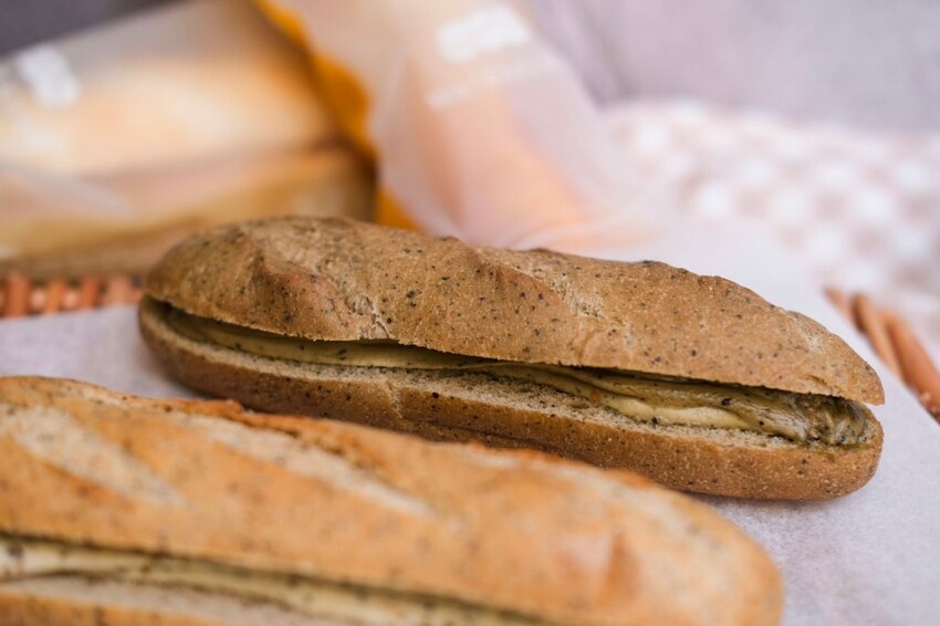 ▼【WA!BAKERY】夾心棍棍尺寸約手掌大小,吃完一個還蠻有飽足感的,咬起來不像法國長棍麵包硬口,取而代之的是酥脆Q彈的食感,烤過後享用嚼起來帶有香氣,除了香蒜切達起司口味是五辛素 , 其他口味皆為奶素。