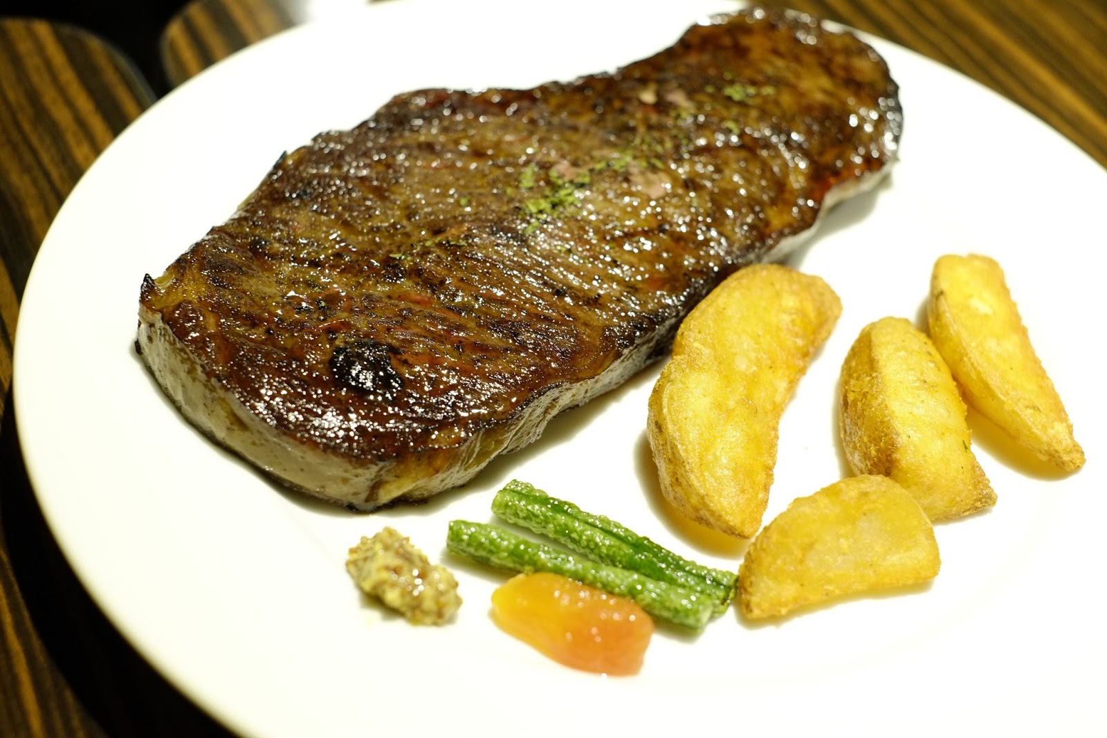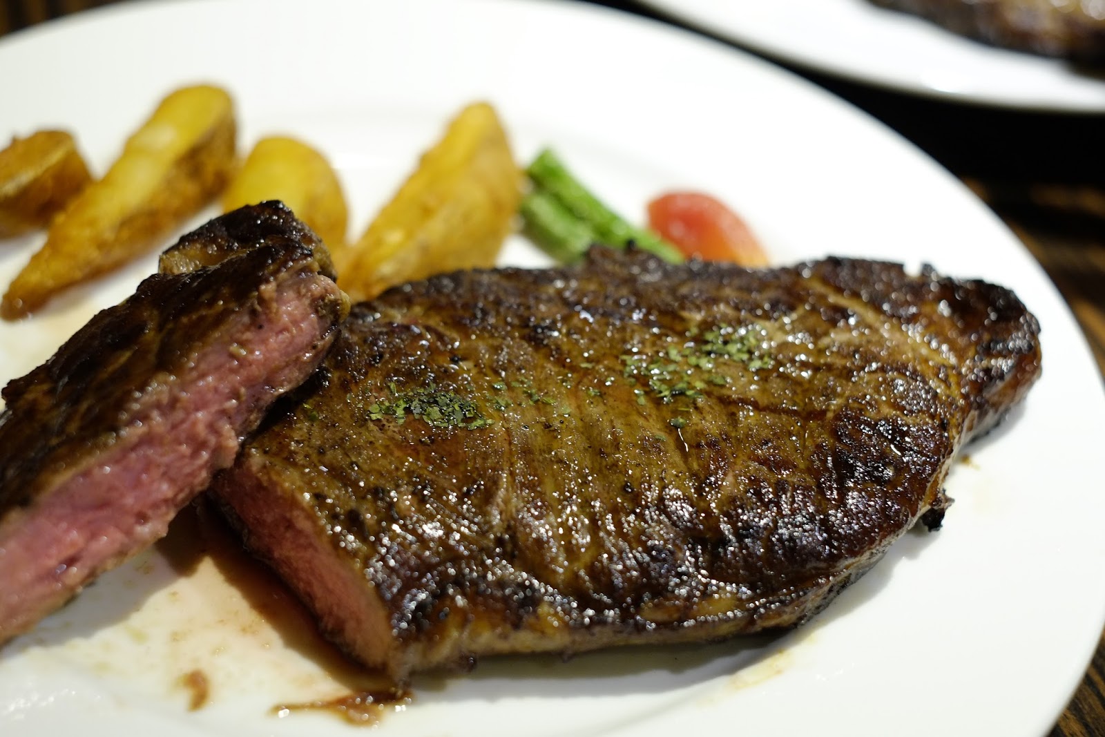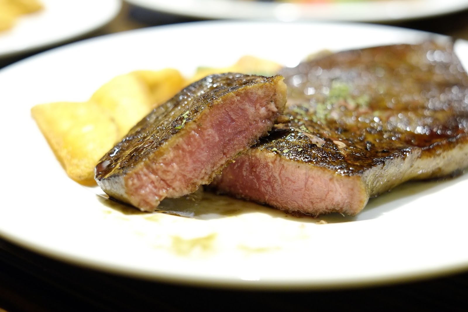 牛排份量蠻大的,薯塊不會很多,略帶點鹹味,我覺得炸得更酥一點會更不錯。乾式熟成與想像中的味道好像不太一樣,不過也沒吃過其他熟成牛排,無從比較,就感覺來說,能感到肉的軟嫩與油花,嘴巴也是充滿香味,連接骨頭的肉超香跟美味!可是在口中咀嚼跟一般牛排不太一樣,有點像是金華火腿(飄),可能我不懂乾式熟成,比較沒有讓人有特別驚豔感,哈哈哈。