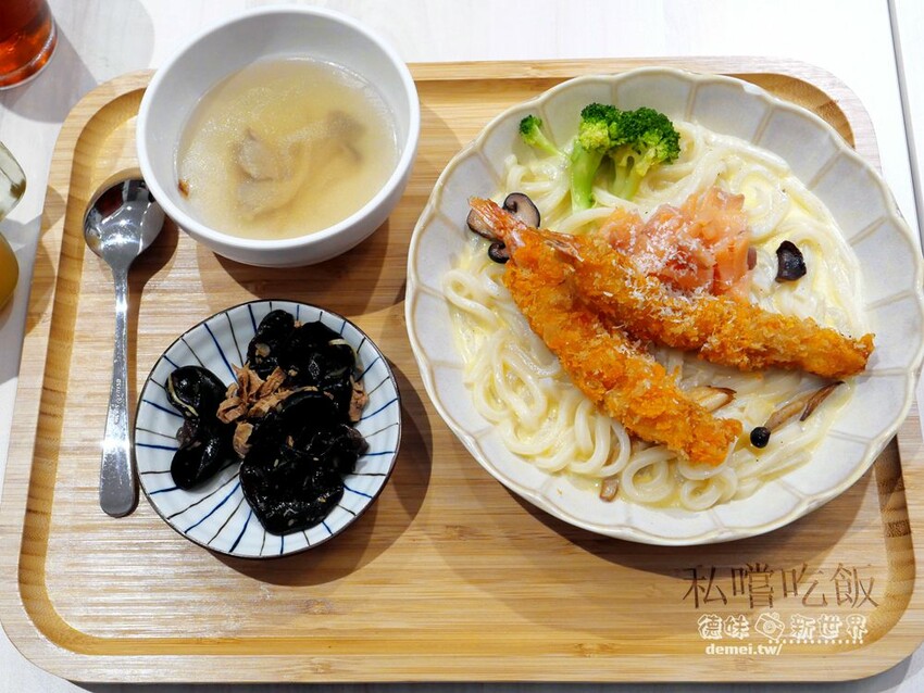 整份餐呈現出軟嫩與煙燻氣味、搭配酥脆炸蝦、以及奶香烏龍麵,多層次使味蕾不單調。