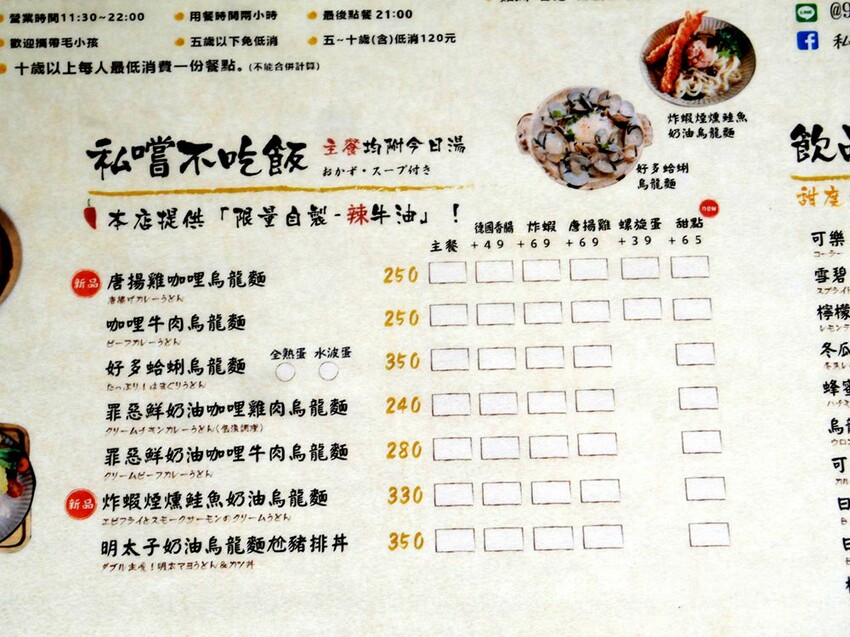 主要販賣咖哩飯、烏龍麵、輕食沙拉、兒童餐、小酌&飲品,可免費續湯、咖哩醬一次,