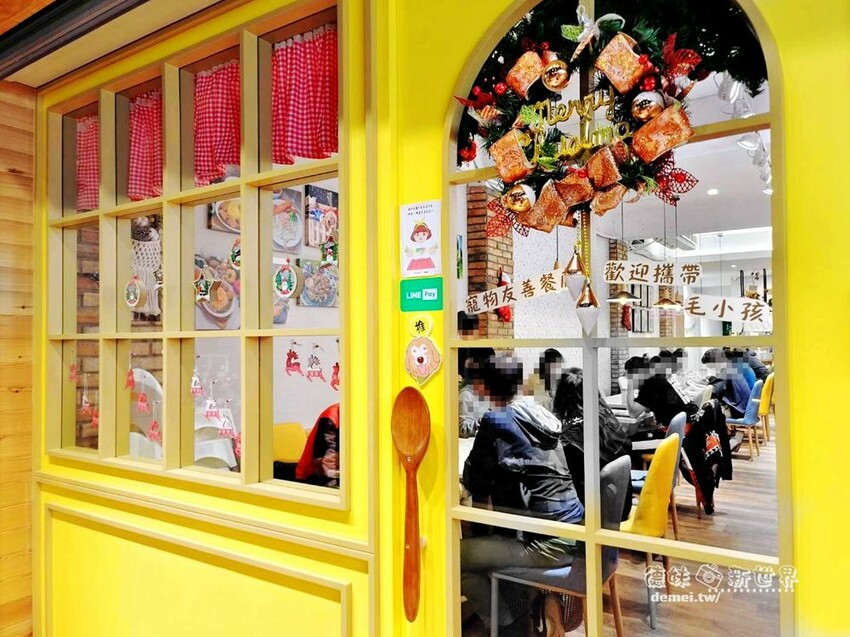 「寵物友善餐廳,歡迎攜帶毛小孩」,顯眼的字樣就貼在繽紛的聖誕裝飾下,