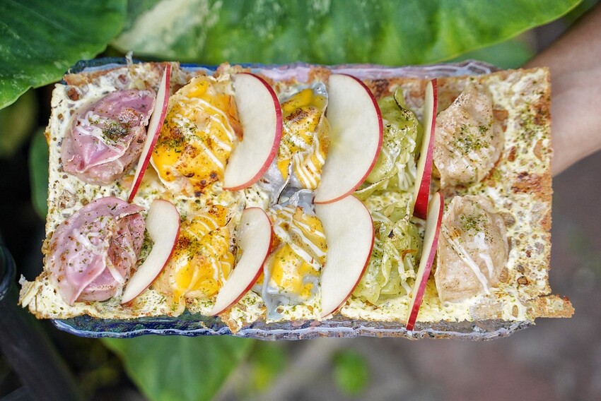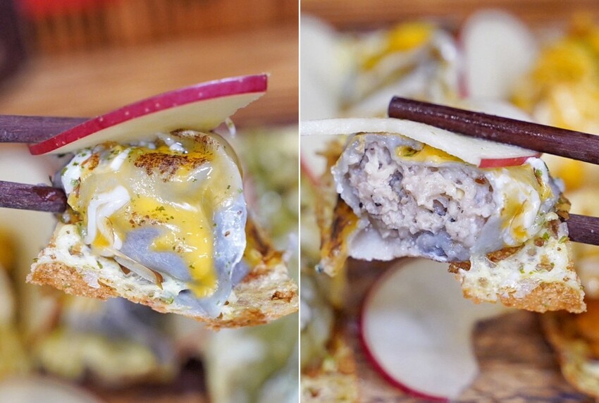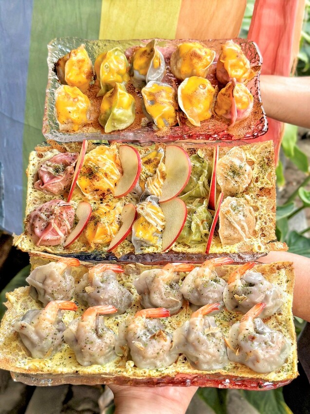 黃色餃皮是「韓式泡菜燒肉」,以自製韓式泡菜混入帶有蜂蜜與燒肉醬風味的肉餡,搭配鹹香起司真的好吃到不行!「熱帶夏威夷」是選用蝶豆花來製成的藍色餃皮,豬肉餡料特別加入起司與牛奶,還有鳳梨來增添酸甜滋味,整體吃起來較清爽一些。