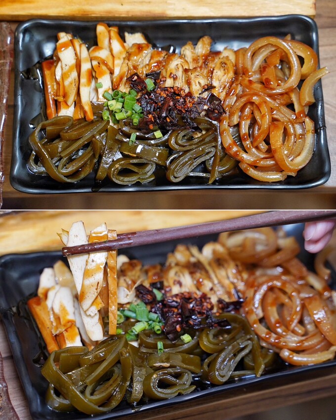 「綜合拼盤」除了有常見的海帶、豆干之外,還有香Q不油膩的豬皮,沾點特製醬料更對味。