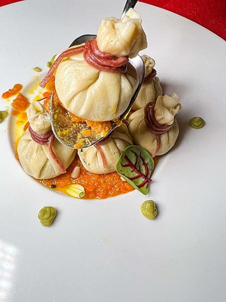 這道也是新菜色,一上桌就覺得也太精緻可愛了吧!每顆手工製作所以皮比較厚一顆顆像小籠包😆內餡是大名鼎鼎的藍紋起司為基底來製作,所以味道非常濃郁但因為我是起司控所以很喜歡~這道是偏重口味,藍紋起司的香氣很適合來杯酒搭配,下方的醬汁則是蟹黃紅羅蔔~搭配起來很特別很順口蟹黃的鮮味口齒留香