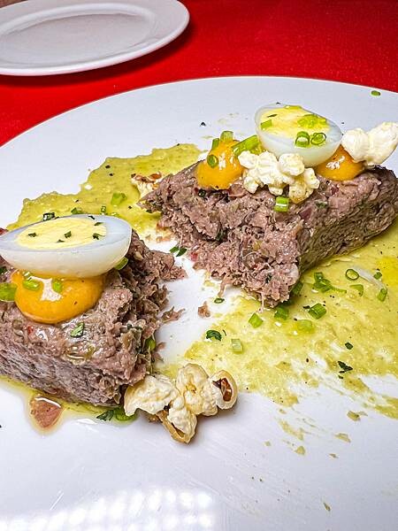 使用美國菲力牛,將其與蛋黃、紫洋蔥、酸豆、酸黃瓜、花椒油拌在一起,看不太出來是生牛肉,經過調味是帶點酸但比例又很剛好也有壓掉生牛肉的腥味,底部醬汁則為青豆仁醬這個醬味道還不錯!搭配起來可以中和酸度,整體很特別很新鮮!