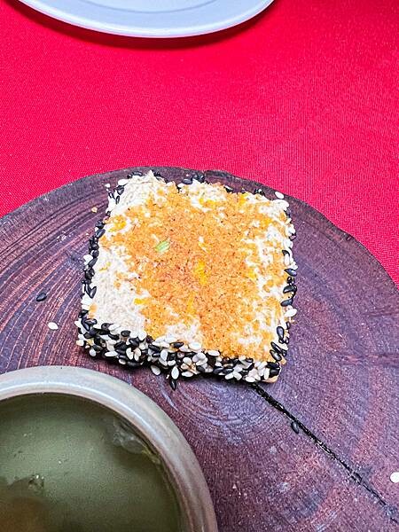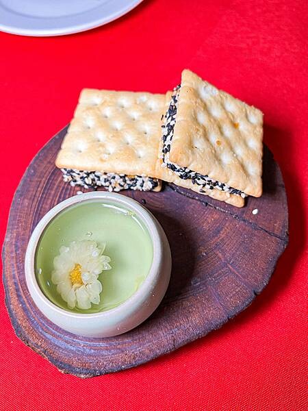 這道好特別✨一上桌看到鴨肝夾心餅乾,搭配點裝飾有點中式的feel~主廚選用加拿大鴨肝製作鴨肝醬,灑上些許烏魚子與橙皮!搭上清新淡雅的菊花茶好特別!建議可以先喝口菊花茶再品嚐鴨肝餅乾,別有風味,餅乾很酥脆一口咬下滿滿的鴨肝醬入口~香氣十足蠻有層次感的偏重口味,但我覺得跟蘇打餅乾很搭是個可口的開胃小點!