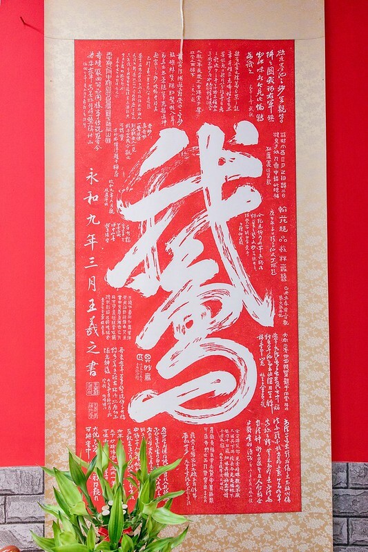 店裡就一般小吃店的裝潢,倒是乾乾淨淨,門口一張愛鵝成痴的王羲之草書「鵝」字帖。