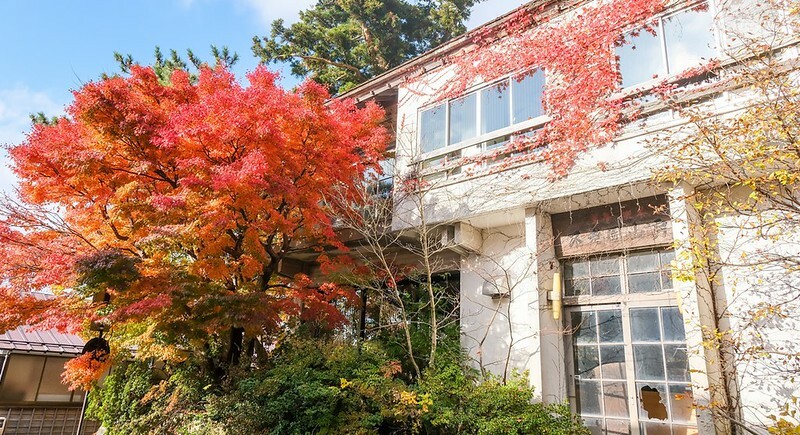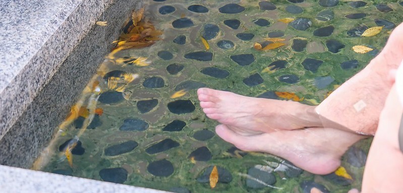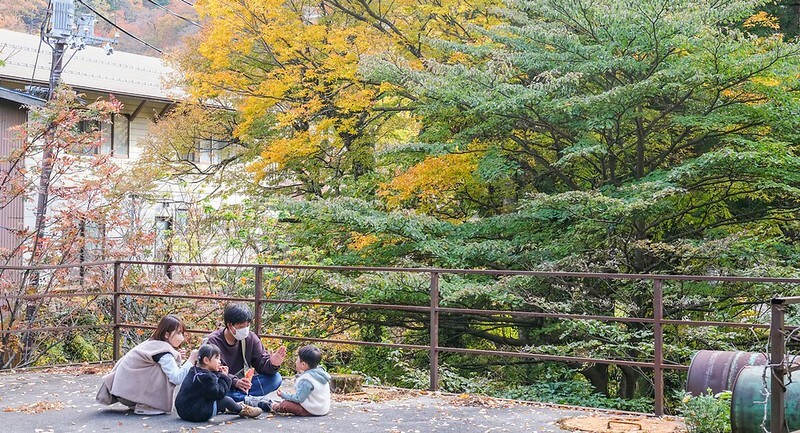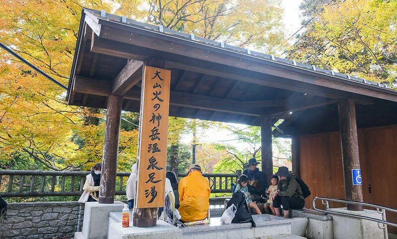 吃栗子燒最佳地點,就是一旁的「大山火之神岳足湯」,一邊吃栗子燒,一邊泡足湯,抬頭就是隱隱約約、閃動的紅葉,有什麼比這更幸福的嗎?