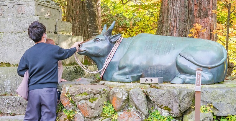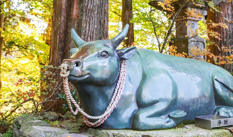 故於大山寺山腰間有著象徵牛馬市場,鼻子上綁著繩子的牛銅像,就像當時大山道沿途的道路和驛站般,如今參拜的旅人摸著牛的鼻便能得到祈福、健康。