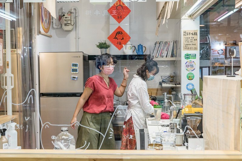 透明的玻璃櫃前,有一點點像半開放式的餐廳,可以清楚看到沖咖啡、製作甜點的過程,也算是市場難得的悠閒療癒風情。