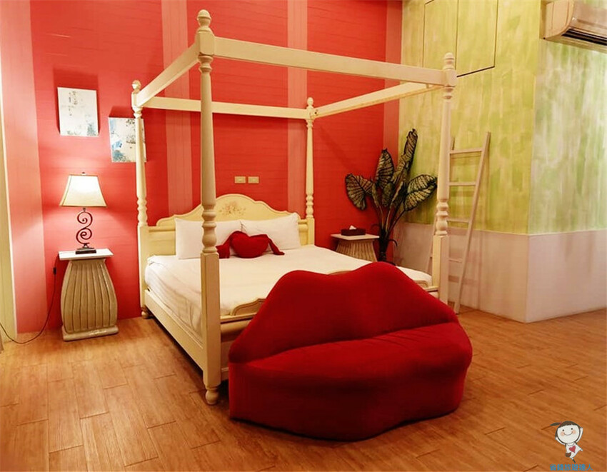 一進房就先看到這個美美的公主床,只差沒有掛上蚊帳而已,床前還有個嘴唇造型的沙發