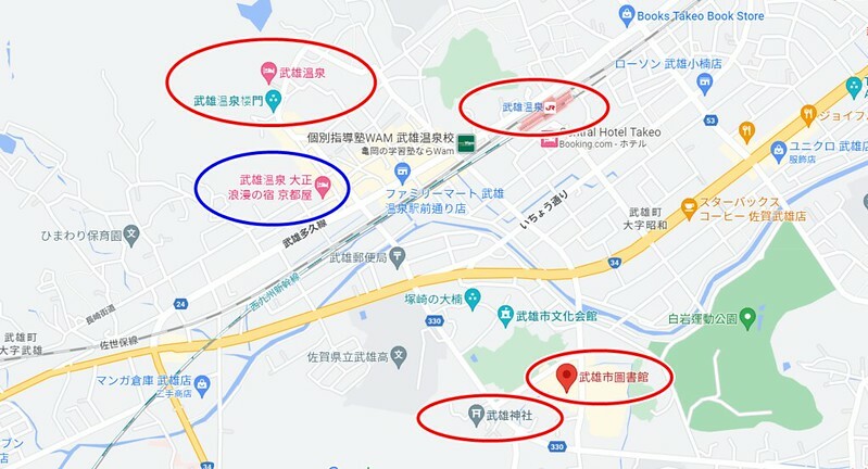 當天我們的武雄溫泉一日遊,主要的三個景點,佐雄溫泉、武雄神社及武雄圖書館,都在武雄溫泉站周邊步行15分鐘可達的地方,如果你還有一點腳力,一天全收集八成沒問題,要不車站裡也有自行車可以租借。當晚,我們入住的是武雄溫泉街上,擁有千年溫泉的百年溫泉旅館「京都屋」。