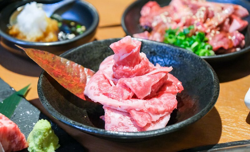 和牛中落ちカルビ650円,中落簡單說就是修過邊邊角角,形狀比較沒那麼漂亮的肉,通常價位會比較便宜,但好吃、美味的程度倒是相差無幾,想省荷包的朋友,不妨直接點「中落」就對了。而且這家蠻用心的,還擺成一朵花的樣子。