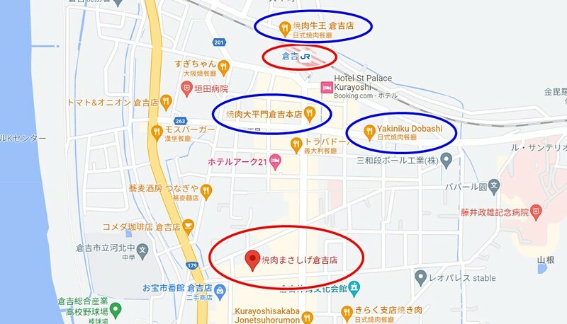 雖說鳥取的和牛很是厲害,但以tabelog來說,倉吉並沒有分數多高的燒肉店,查了一下最高的也不過是3.22的「焼肉屋大平門」,最後我們選擇的是本店在鳥取市的焼肉まさしげ,另一個理由是旁邊就有停車場,當然最重要的是不用等就有包廂的位子。大抵下透過地圖就能發現倉吉車站旁就有不少家燒肉店。