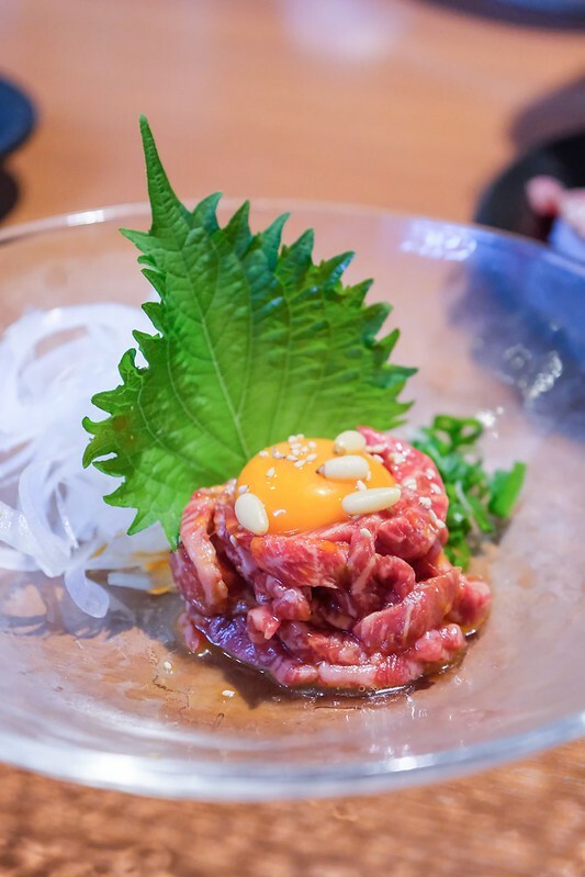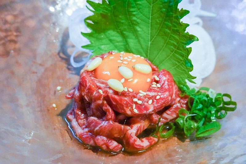 和牛ユッケ1,100円,ユッケ就是韓文生拌牛肉的意思,大致上是和牛去掉的邊邊角角,淋上一點帶甜味的醬汁再打上一個能生食的雞蛋,口感滑順、牛肉鮮甜又有著鳥取牛豐富的油質,相對來說因為切的是比較厚粗的牛肉條,吃起來又帶著微微的軟Q口感和多一點點的綿化,好吃的亂七八糟。