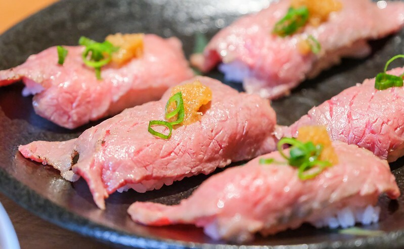和牛にぎり(和牛握壽司)一共有四種不同價位的選擇,和牛トロにぎり820円、和牛炙りトロにぎり820円、和牛にぎり750円和牛、炙りにぎり750円,我們點的是和牛にぎり750円,鳥取牛的口感真的是很軟很細很綿,上面是微微聚甜的白蘿蔔泥,在咀嚼端也多少補足了一點水份和增加化口的效果,雖然一口就得近200台幣,但真的是好銷魂。下次我想點和牛炙りトロにぎり820円。