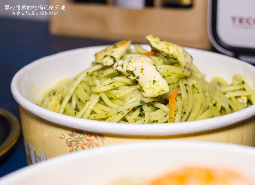 ▼香料嫩雞義大利麵(青醬/$100,加直麵+10元)