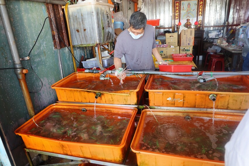 三點蟹最容易辨識的就是殼上的三個黑點,而三點蟹很容易因為水溫鹽度變化而死亡的蟹種,稍微不舒服就斷腿死亡,好銷貨但不好存,這天老闆見到品質不佳的三點蟹就會直接從大水桶裡取出淘汰。