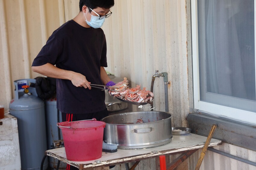 三點蟹原本黑黑的三點,蒸煮熟透後就成了橘紅色的。
