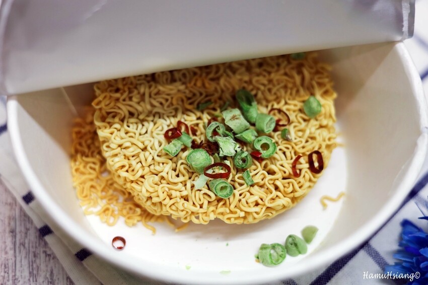 ▼蔬菜包先倒入,有敏豆以及辣椒圈,比較少見泡麵的蔬菜可以這麼大又不乾扁的