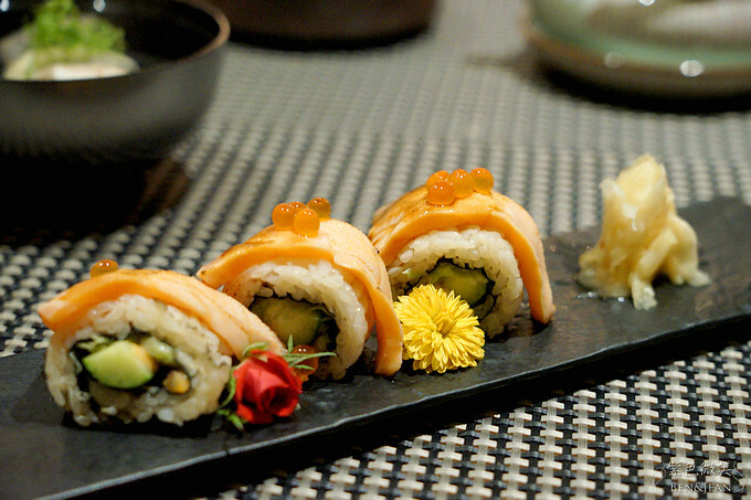以壽司卷包裹龍蝦沙拉及蘆筍,搭配新鮮鮭魚肉及鮭魚卵,炙燒後更香氣豐盈,濃厚海鮮味中融合了壽司的柔軟與嚼勁,也增添了不少飽足感哦